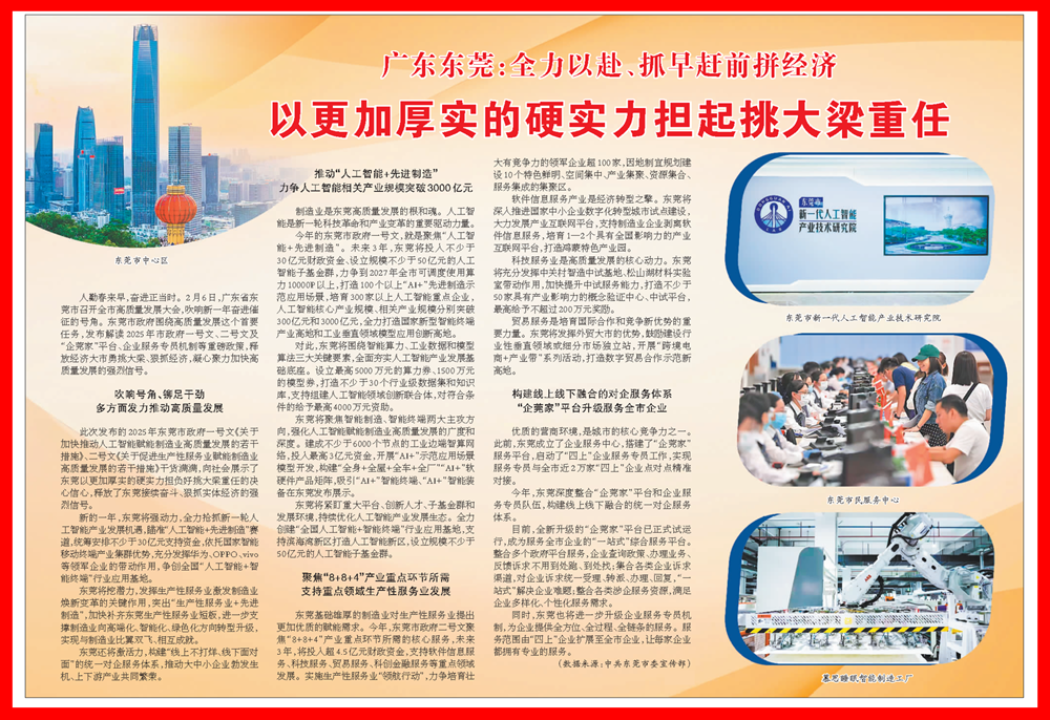 2025年2月6日,东莞市召开全市高质量发展大会,正式发布《关于加快推动人工智能赋能制造业高质量发展的若干措施》(一号文)与《关于促进生产性服务业赋能制造业高质量发展的若干措施》(二号文),提出未来三年统筹超30亿元财政资金、设立50亿元人工智能子基金群,力争到2027年人工智能核心产业规模突破300亿元,相关产业规模达3000亿元,全力打造国家级智能终端产业高地和工业垂直领域模型应用创新基地。