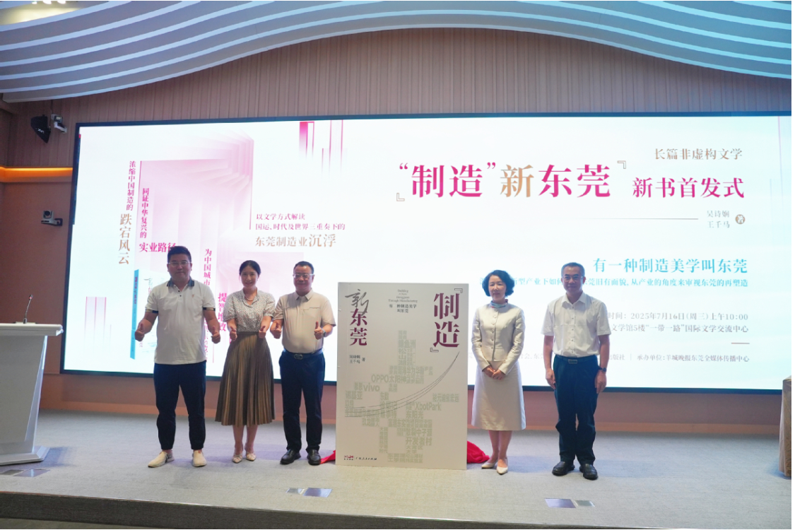7月16日的广东文学馆内,墨香与金属模型同台陈列。当红绸从烫金封面的《制造新东莞》上滑落,东莞市作协副主席吴诗娴轻抚扉页的激光雕刻地图——这幅由东莞22个镇街地标构成的"智造星图",浓缩了这部50万字非虚构作品的创作历程。在省作协、人民出版社等百余位嘉宾见证下,这部历时两年调研、由财经作家王千马与本土作家吴诗娴联袂完成的作品,成为东莞撤县建市40周年的文学献礼。