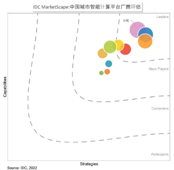 IDC近期发布的《IDC MarketScape: 中国城市智能计算平台市场厂商评估,2022》研究报告(以下简称“报告“)显示,随着智慧城市落地需求的增加,AI算法本身的精准度和种类也将不断增加,未来智慧城市算法将会是“定制化、专业化、精细化”的人工智能服务,具有相关算法训练和数据服务能力的厂商将发挥极大的竞争优势。这份报告显示,在智慧城市建设领域,百度智能云凭借领先的AI技术、产品及解决方案占据市场份额首位,整体位居中国城市智能计算平台领导者象限。