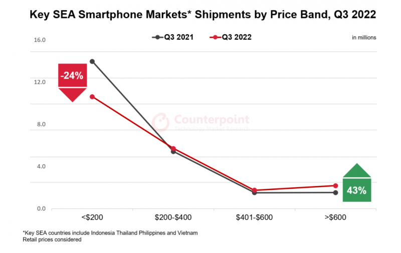 数据指出,2022年第三季度,东南亚主要市场400美元以上(约合人民币2800元)的高端智能手机出货量年同比增长29%,但200美元以下(约合人民币1400元)的普通智能手机出货量则下降24%。