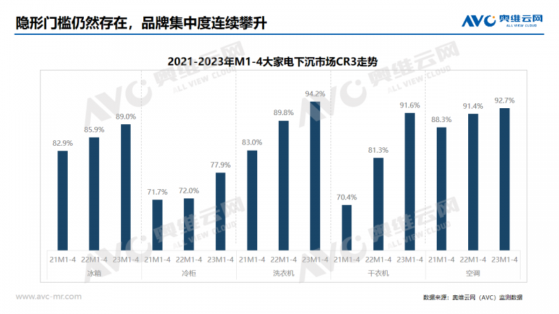 另一方面,奥维云网数据显示,下沉市场的品牌集中度较高,其中,2023年1月-4月,下沉市场洗衣机品类TOP3品牌的市场占比达到了94.2%。中国家用电器协会执行理事长姜风在接受中国家电网记者采访时曾表示,头部企业产品结构完善、对政策的重视敏感度强,能够迅速响应。她建议中小企业快速提升产品、渠道和政策反应等能力。姜风讲到:“无论产品还是实施区域,中小企业要选自己有优势的地方去实施重点关注、布局,才可能赢得这波机遇。”