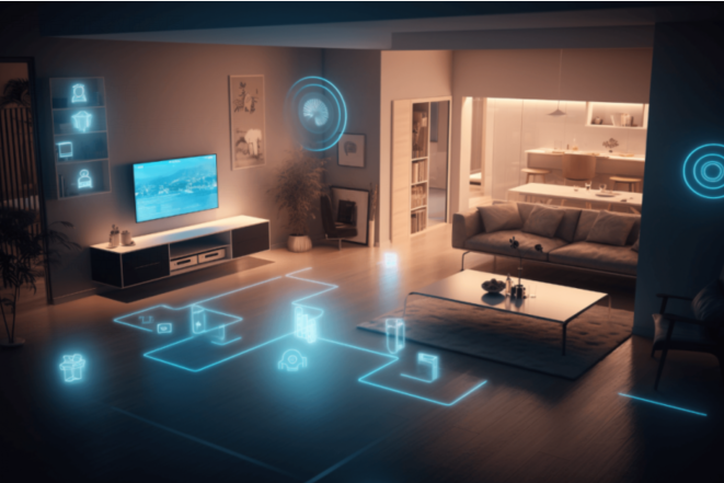 每天清晨,伴随着悠扬音乐起床,窗帘自动拉开,房间里传来一个甜美声音,提示今天的天气、穿衣指数;走进洗漱间,只需手指轻点屏幕,墙上的智能魔镜自动播放当天的新闻、交通路况;洗漱完毕,智能厨电已经根据烹饪曲线和菜谱自动烹饪好营养早餐;下班回家,人脸识别即可进门,柔和的灯光慢慢打开,音响开始播放定制歌单,空调、新风等家电设备感应并自动开启;傍晚时分,足不出户在家里进行AI私教带来的健身运动,热水器也自动调至合适温度……