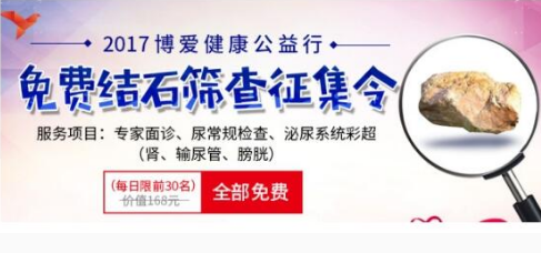 为提高我市结石病普查率,降低结石病发病率,即日起至1月31日,深圳博爱医院开展免费结石筛查公益活动,凡已患或疑似患者有肾结石、输尿管结石、膀胱结石、尿道结石、胆囊结石、胆总管结石、肝内胆管结石的患者,均可报名参加免费结石筛查活动。