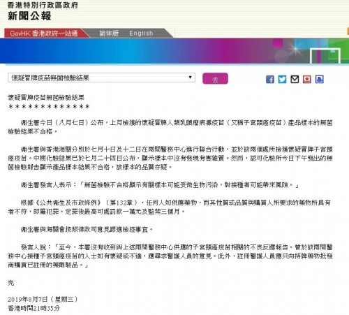 8月7日周三,香港卫生署经过近一个月的调查,终于公布7月于香港两间注册医务中心检获的163盒冒牌9价HPV疫苗的检测结果,检测证明部分样品“不含子宫颈癌成分”(即假疫苗)、部分样品“无菌检验不合格”,有机会“受微生物污染”(即成分有害),或会对接种者造成伤害!