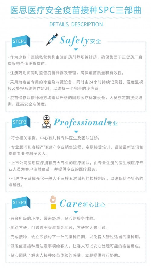 香港安苗医疗中心还创造性设立“SPC安全疫苗接种标准”,环环相扣,确保为市民提供最安全Safety、专业Professional及具关怀 Care 的疫苗接种服务。