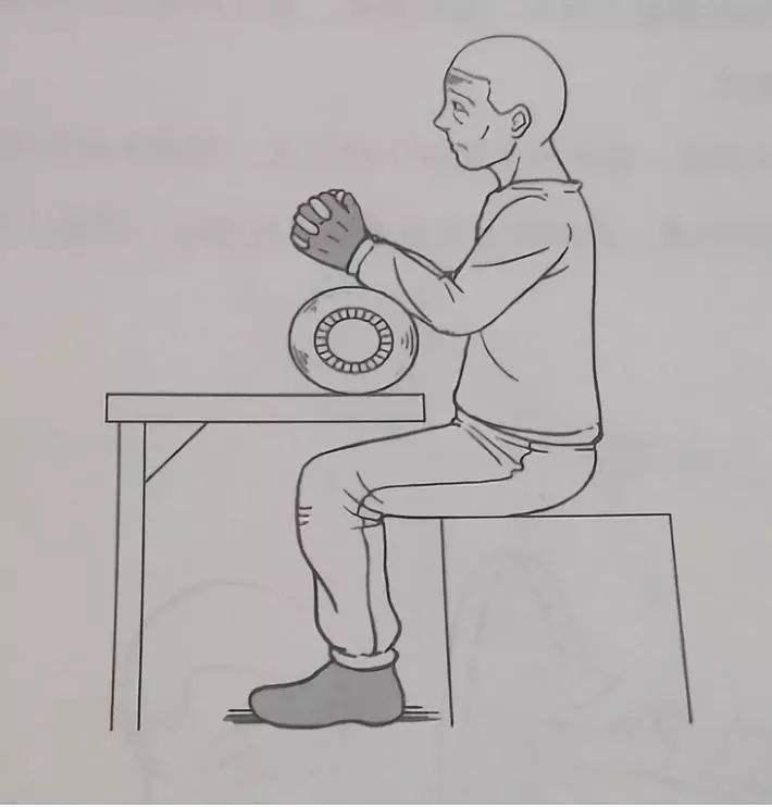 患者坐在治疗台旁,双手叉握,前臂放在滚筒上;