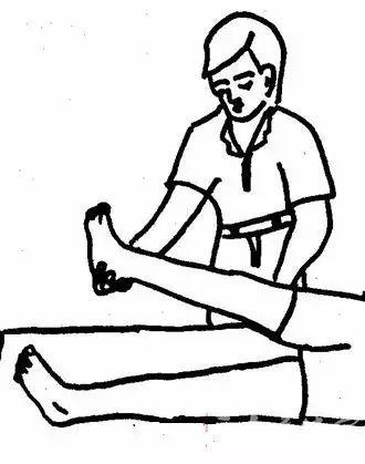 患者仰卧,下肢伸直;训练者一手握持踝关节上方,另一手握紧足跟及跟腱并以前臂抵住脚掌;向上用力拉足跟,使踝关节背屈。