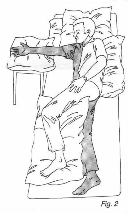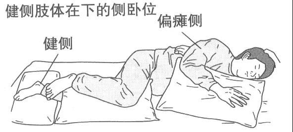 头枕枕头,患侧肩部和臀部用枕头支撑;头稍转向患侧,患侧上肢伸展,下肢稍屈曲;该体位尽量少用。