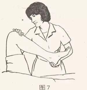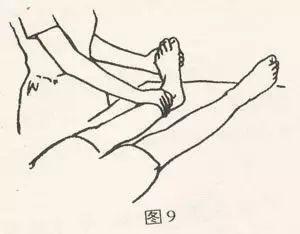 患者仰卧,训练者一手放在膝后部,另一手握住足跟并以前臂抵住脚掌,使足与小腿成90度角;上抬小腿,使髋关节及膝关节屈曲。