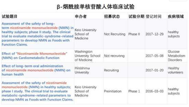 β-烟酰胺单核苷酸是NAD+的前体,2013年哈佛医学院David Sinclair的教授研究发现:服用β-烟酰胺单核苷酸一周后,相当于人类60岁的小鼠恢复至20岁状态,并延长了30%的寿命。2018年David团队更是再次惊人发现:20个月的小鼠服用两个月β-烟酰胺单核苷酸后,运动耐力提高了56%到80%,且毛细血管密度、血流速度和年轻小鼠相似。“返老还童”的效果为β-烟酰胺单核苷酸赢得了哈佛“长生不老药”的称号。《Nature》《Science》《Cell》等权威期刊在后续的研究中,从激活干细胞、维持端粒长度、修复DNA角度方面,进一步揭示了β-烟酰胺单核苷酸延长寿命的机制。