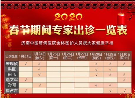 新春佳节是走亲访友团聚感情的幸福日子,济南中医肝病医院在此提醒广大肝病患者,不要因为过年就打破了平时养成的良好生活习惯,避免进食大鱼大肉,饮食无节制,避免饮酒,避免走亲访友太过劳累,注意休息,不熬夜,过年期间出现身体不适及时到院就诊,不要因为是在过年期间就延误疾病,为了守护广大肝病患者平安过年,济南中医肝病医院安排2020春节期间专家出诊一览表。