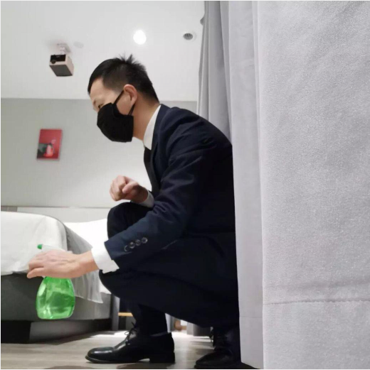 然而在他刚刚搭建好团队,正竭尽所能提高入住率让业主看到希望的时候,突如其来的新型冠状病毒肺炎的肆虐,打破了一切创造奇迹的可能。门店地处商业中心,交通枢纽,距离疫情发源地华南海鲜市场只有地铁5站的距离,属于疫情重灾区。在疫情蔓延的1月,他每天都会对酒店的房间、公共区域、厨房、电梯、前厅进行消毒。团队里都是年轻人,要每天保持和员工有效的沟通,稳定员工的恐慌情绪,做心理辅导,和员工统一战线,让员工保持战斗力。