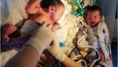还不到喘气的时候!接下来才是双胎分娩最为关键的环节——小胎儿本来就处在非常危险的横位,处理不当极有可能要中转剖宫产。立即腹部固定,维持呈纵产式,高浮的小屁屁一点点下降进入产道,令人窒息的十分钟等待,以臀牵引的方式顺利诞下另一女婴。警报仍未解除!由于早产了一个月的婴儿肺部发育不成熟,二宝出现了呼吸骤停风险,团队一边做分娩后续工作,一边迅速展开婴儿的抢救,进行新生儿复苏气管内给药。19点10分,伴随着响亮的啼哭声,现场所有人悬着的心终于放了下来。大胎儿2.3公斤,小胎儿1.8公斤,母子平安。