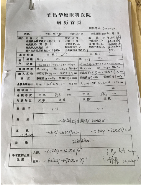 本人右眼400度,左眼500度,均伴有不同程度散光。戴框架眼镜15年。2019年下半年开始考虑做近视矫正,并对宜昌的医院(华厦、爱尔、中心医院等)进行了较为全面的调研,主要调研和比较了医生水平、手术方式、手术设备、费用支出和优惠力度。2020年4月2日做德国蔡司smile3.0全飞秒手术摘镜。目前(2020年4月30日检查结果)视力右眼1.5-,左眼1.5。