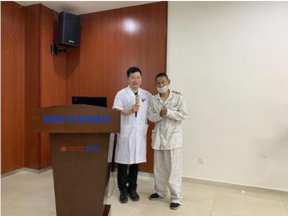 2020年5月7日,成都长生肾病医院5.12护士节表彰大会正在进行,突然出现的一位“特邀嘉宾”吸引了所有人的目光——他就是四个小时前刚刚做完二期取石手术的肾结石患者杨先生。经过两次经皮肾取石手术,杨先生已经能够下床行走,自由活动,手术无管化也给杨先生的活动和康复带来了极大的便利。