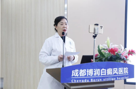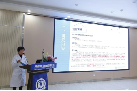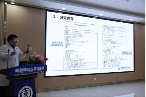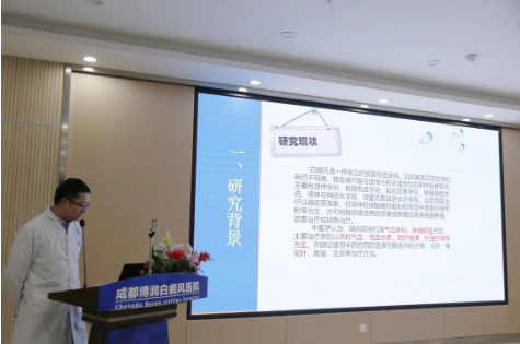 会议开始,由成都博润临床研究生段琛、贾浩分别对市级科研项目《白癜风患者的流行病学因素及行为特征调查与对策研究》《桂红消白汤热溻联合梅花针叩刺治疗稳定期白癜风的临床研究》进行了介绍和展示。