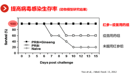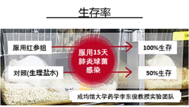 1、成均馆大学药学李东俊教授曾针对得感染肺炎球菌的老鼠进行对照组实验,实验结果显示,在肺炎球菌感染下的老鼠,只服用生理食盐水的对照组只有50%生存,而服用了红参浸膏的实验组则获得了100%的生存![4]