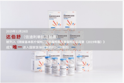 2019年11月28日,国家医保局发布新版医保目录显示:创新PD-1抑制剂达伯舒(信迪利单抗注射液)被列入新版《国家基本医疗保险、工伤保险和生育保险药品目录(2019年版)》乙类范围,成为此次通过医保谈判唯一成功列入国家医保目录的PD-1单抗药物。这意味着,自2020年1月1日起,使用信迪利单抗注射液且符合医保规定医学条件的患者可以按规定进行报销,自己只需承担报销之后的费用。