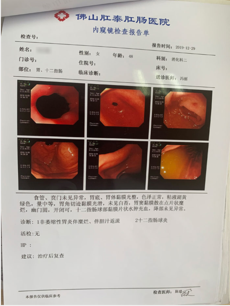 接诊的是冯医生,冯医生问了我的症状,过去治疗的药物,治疗后的感受,还有平时喜欢吃什么食物等等,反正问的很多的,之后又给我把脉,还让我躺在诊室的检查台上,用好像是叫什么听诊器的东西给我检查,这个没有收费。检查之后,她说根据她的经验,我的应该是有胃炎,胆汁返流,还有可能是十二指肠球部可能也有炎症。为了确诊她,她建议让我做胃镜,因为我患病时间这么长了,药也吃了一大堆,但是一直没有治愈,说明病灶还在里面,要确定病灶对症治疗需要做胃镜检查。其实开始我是拒绝的,因为听不少朋友提起做胃镜难受的经历,因此过去去其它医院一直没有同意做胃镜。