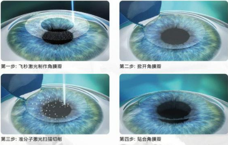 半飞秒激光手术是飞秒激光制瓣+准分子激光角膜塑形的原理。先用飞秒激光制作角膜瓣,掀开角膜瓣后;再用准分子激光切削角膜基质,改变屈光度;然后再将角膜瓣复位,手术完成。