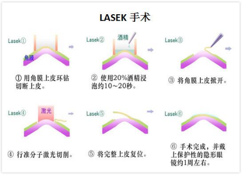 LASEK简称EK,EK手术不做角膜瓣,直接在角膜的基质浅层进行激光切削,较大程度保留了角膜的基质层,术后角膜的生物力学稳定,手术相对安全。适合角膜薄、度数低、不能做SMILE、LASIK手术的患者,适合经常需要剧烈运动的人。但术后症状明显,视力恢复慢,有部分眼部敏感患者伴随术后疼痛感。