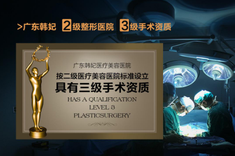 广东韩妃医疗美容医院是经相关部门批准成立的省整形二级医疗美容专科医院,具备开展1-3级整形手术项目资质,不同资质的医院允许开展的项目不同,像全面部除皱术、全面部磨削术、洗纹身、2000ml≤吸脂量<5000ml等大型高难度三级手术项目必须由具备二级整形外科医院、设有医疗美容科或整形外科的二级综合医院,或者整形美容医院经审核拥有三级手术项目资质的医院方可开展,而目前广东韩妃医疗美容医院是省内唯一一家省整形二级专科(三级手术高资质)医疗美容医院。