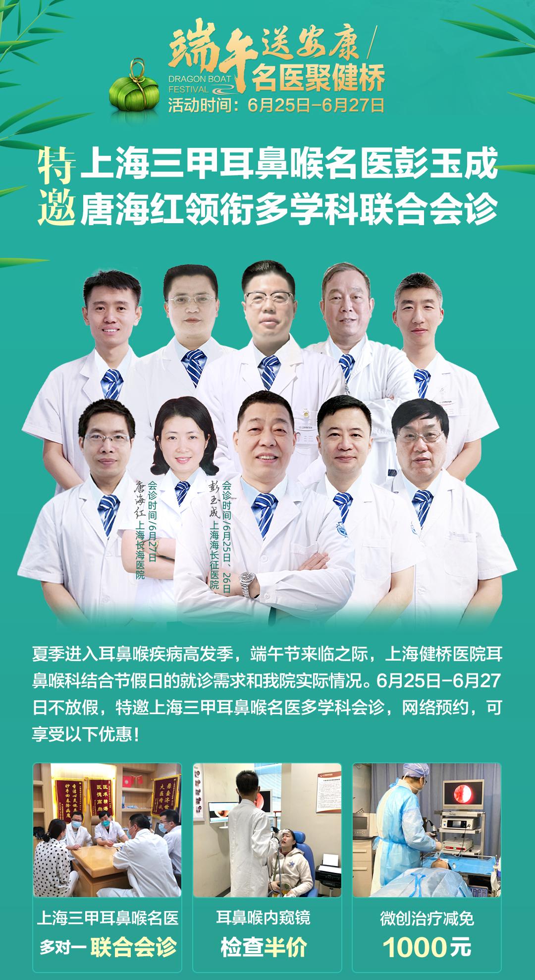 夏季天气炎热,家里、办公室、各大商场都开起了空调,室内外温差明显,很容易引发急性鼻炎、过敏性鼻炎、咽喉疼痛、头晕耳鸣等疾病。端午佳节即将到来,根据《国务院办公厅关于2020年节假日安排的通知》,6月25日—6月27日为端午节小长假,为结合节假日的就诊需求和上海健桥医院实际情况,上海健桥医院决定在端午节期间,全体医务工作人员仍照常上班。耳鼻喉科特邀上海长征医院彭玉成教授、上海长海医院唐海红教授领衔多学科会诊。助力久治不愈、反复发作耳鼻喉疾病患者,早日走向健康!