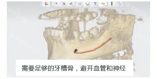 在下面大牙牙根的下方,有一条管牙齿感觉的神经,叫做下牙槽神经。如果骨头不够而贸然将种植体植入,除了会造成种植体不稳,还容易损伤牙齿神经,造成下巴和牙齿的麻木,严重情况会难以恢复。