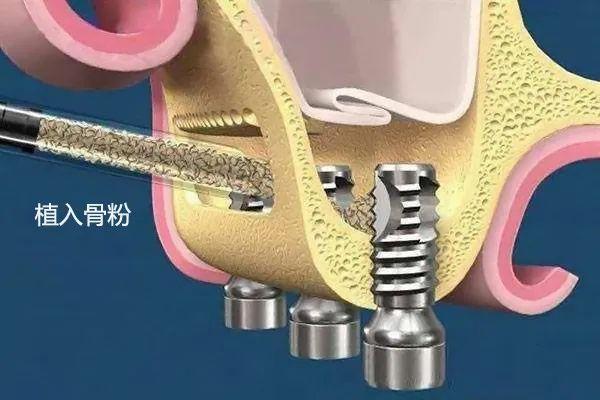 植骨是通过植入人工骨粉来补足种植牙植入条件的一种常用方法,人工骨粉的优点是无需损伤自体取骨。植入前会严格测量牙槽骨骨量的密度、高度,再将骨粉直接放入牙槽骨骨内,让它和牙槽骨逐渐结合在一起,供种植体植入。