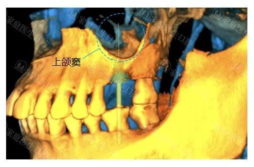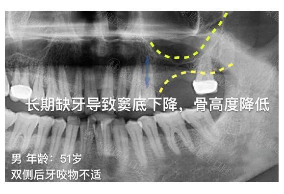 在上面大牙牙根的上方,有一个空腔,称为上颌窦。如果上颌窦过大或者牙槽骨本身不多,缺牙区域的骨头顶部和上颌窦距离很近,强行种植的话会直接穿通上颌窦,造成感染甚至种植体发炎、脱出。