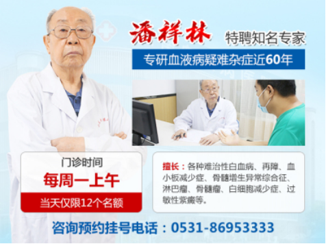 潘祥林,专研血液病疑难杂症近60年,济南血液病医院特聘知名专家,长期入驻济南血液病医院。由于是知名专家门诊,潘主任只有周一上午坐诊,并且当日门诊仅限12个名额,有需要的患者,一定要及时拨打24小时预约电话:0531-86953333进行咨询预约。