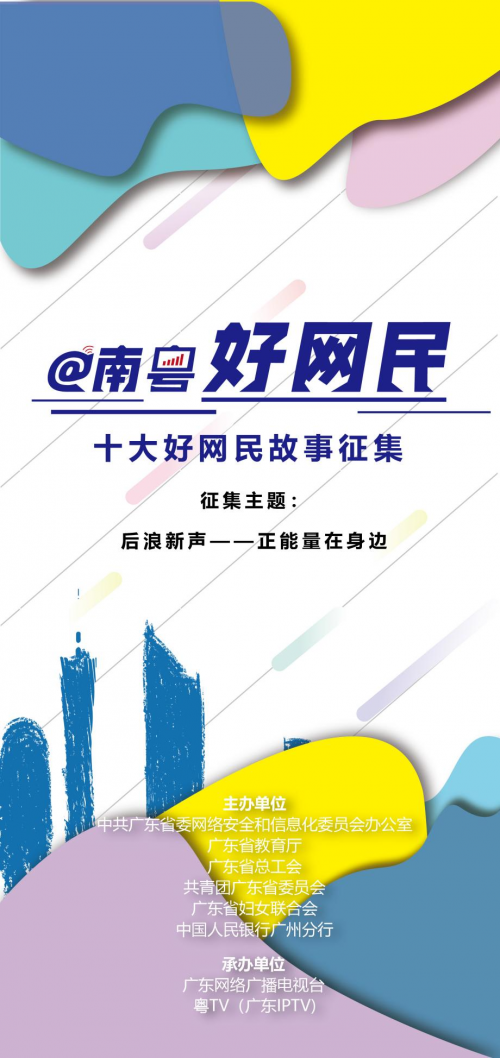 本次系列活动首先开启主题为《后浪新声——正能量在身边》的“南粤好网民故事会”网络征稿。通过专家评审和网友点赞,活动将评选出广东地区最具代表性和感染力的十大好网民故事,并对这些故事进行广泛展示、宣传,以此带动广东地区更多青年争当好网民,传递身边正能量。