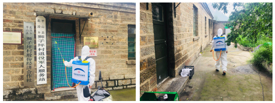 (勤消毒,防反弹,蓝天中医院防疫人员正在进行消杀)