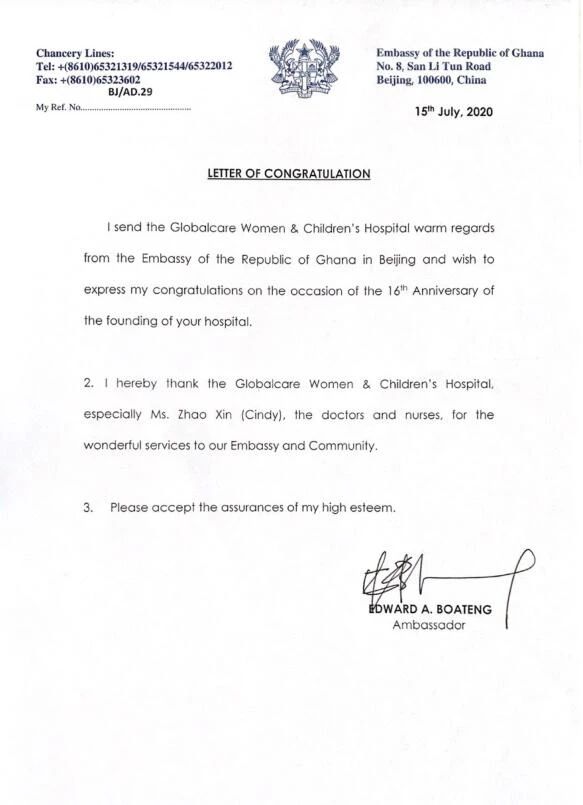 我代表加纳共和国驻北京大使馆向北京五洲妇儿医院表示热烈祝贺,祝贺五洲16周年生日快乐。