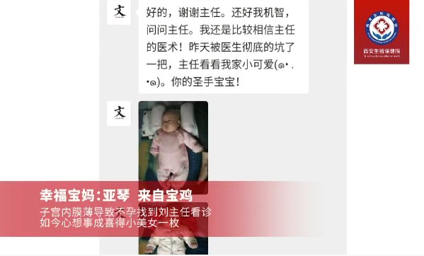 西安不孕不育医院:细心再细心才能助她们早得好孕!生了!生了!幸福宝妈:亚琴,来自宝鸡。主诊医生:刘梅梅主任。亚琴的宝宝一百天了,特意给刘主任发来宝贝照片报喜,当初亚琴因为子宫内膜异位症久治不孕,找到了刘梅梅主任就诊。经过刘主任专业诊疗不但快速迎来了好孕,还心想事成生下了一枚小公主。你的坚持,终将获得美好!