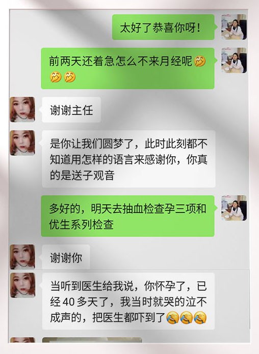 主诊医生:西安不孕不育医院刘梅梅主任。“主任,给你报喜了!谢谢主任,等过段时间去西安了,我们带着鲜花去感谢你,此时此刻真的太激动,太开心了!当听到医生给我说,你怀孕了,已经40多天了,我当时就哭的泣不成声的,把医生都吓到了。”这是丹丹发来的微信报喜文字,可以看出她真的很开心,一路走来的不易都在这一刻得到了回报,只要怀上了,一切都是过往,恭喜幸孕的丹丹,要当妈妈了!