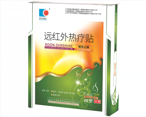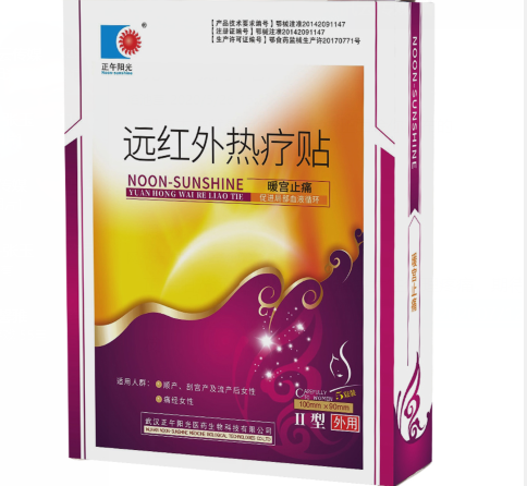 正午阳光远红外热疗贴由武汉正午阳光医药生物科技有限公司自主研发及生产,共有紫红色和绿色两包装类型,紫红色是Ⅱ型远红外热疗贴,大小是100mm*90mm,分2贴、3贴、5贴和10贴装,满足不同女性的需要,避免了量大难销的缺点,销售更加简单。绿色包装是Ⅲ型远红外热疗贴,大小是85mm*85mm,分为2贴装、3贴装、5贴装。使用时沿包装袋打开,取出贴片,揭下防粘离型纸,贴于正对“气海穴”(体前正中线,脐下1寸半)的内裤外侧即可。每日1贴,产妇30天,流产15天,痛经1-2天为止。