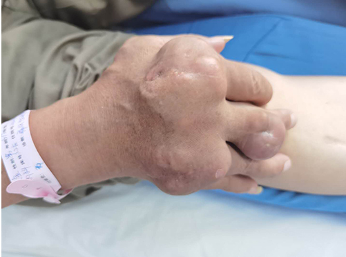据冯先生回忆,那晚是他人生中的第一次痛风,印象老深刻了,右足第一跖趾关节疼的他整晚睡不着。第二天,在当地医院被确诊为痛风,治疗几天后,患处的疼痛消失了,因此也没将其放在心上。就这样,10年间,冯先生的痛风反复发作,每次发作也就服用一些消炎止痛药。直到去年,冯先生多处关节都长出了痛风石,今年3月份时出现右下肢痛风石破溃并伴有粉笔灰状液体流出的情况。几天前,痛风再次发作,服药没有效果,为求进一步治疗来武汉同普痛风专科门诊。