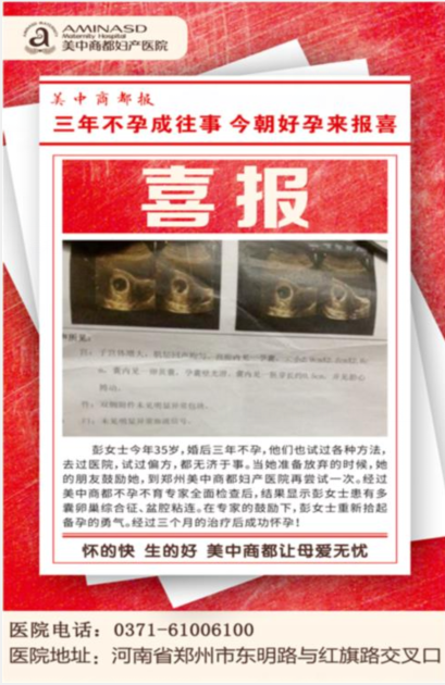 彭女士本年35岁,婚后三年不孕,他们也试过各种办法,去过医院,试过偏方,都杯水车薪。当她准备放弃的时分,她的好朋友鼓励她,到郑州美中商都妇产医院再尝试一次。经过美中商都不孕不育中心专家全面查看后,结果显现彭女士患有多囊卵巢综合征、盆腔粘连。在专家的鼓励下,彭女士重新捡起备孕的勇气,经过三个月的医治后成功怀孕!