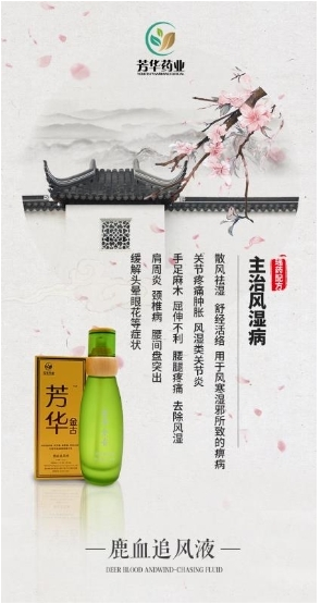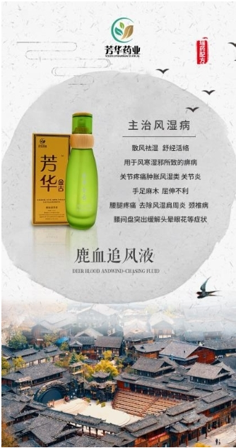 现在由芳华药业公司推出的瑶药配方的芳华金古“鹿血追风液”专治风湿疾病。对于关节疼痛肿胀、风湿类关节炎、手脚麻木、屈伸不利、腰腿疼痛、肩周炎、颈椎病、腰间盘突出、缓解头昏眼花等症状,疗效显著。所蕴含的民族药业中瑶族传统药物的独特秘方,将它直接涂抹用于病灶处,散风祛湿,舒筋活络。通过热疗将毛孔舒张,药物迅速渗透。发散表邪,令血管逐渐扩张,药物经循环调节将大量毒素排出体外。另外鹿血又常见于游牧民族狩猎,取鹿血饮之,自古以来就是宫廷皇族、达官显贵的治病健身珍品。