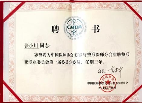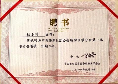 ↑张小川院长受聘于中国医师协会和中国整形美容协会,担任脂肪学术分会双委员