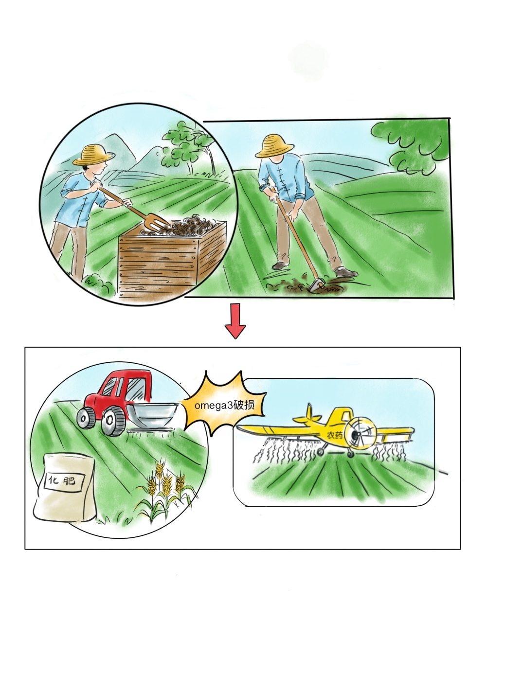 以前对畜禽等动物采取的是放养的形式;这样,它们所吃的食物都来自大自然,比如昆虫、蚯蚓和草等。现在则采取圈养的形式,很多畜禽都失去了活动自由,待在圈里、窝里等着长肉、长油;喂养的食物也是经过加工的精细饲料,尤其是以玉米为主的谷类饲料;不仅如此,有的饲养者还会在饲料中加入激素,以促使畜禽长得更快、瘦肉更多。可见,现在市场上肉类(包括畜禽肉、鱼、蛋和奶制品)的成分也和以前不一样了,Omega-3不饱和脂肪酸等该有的营养成分已经不存在了,而Omega-6不饱和脂肪酸等成分又太多、过剩了。