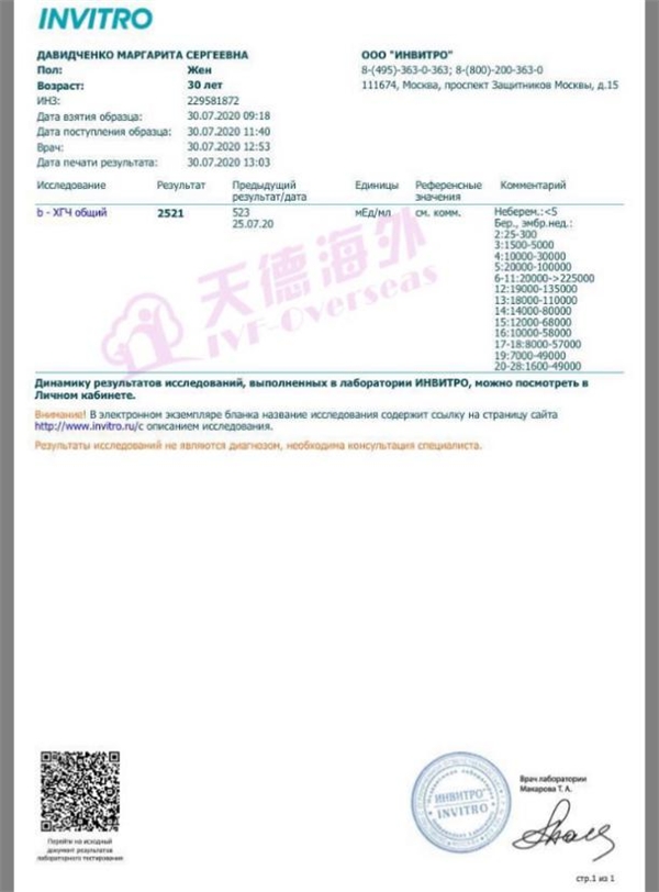 还是我媳妇,她费劲心思,找到了求子群中一个已经退群的姐妹,她是在国外做成功的。从她那里知道了天德海外。不过,按照天德海外的要求,提交报告过去后,又是一盆冷水,他们反馈的莫斯科医生的意见是我这种程度的弱精会影响到囊胚的质量,而,我爱人的体检报告已经过期,难以得出是否能促排的结论,但肯定的是即使能促排,也成功的几率低。接连三次,我们按照莫斯科K+31医院医生的要求补充了报告,在此感谢北京天德海外的工作人员,他们来来回回的转达医生的要求,翻译并提交我们的报告,而且,中国和俄罗斯还相差了5个小时的时差,他们知道我们急等着医生的答复,有的时候转达医生的意见已近凌晨了,辛苦了。