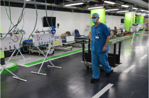 9月23日,在以色列北部城市海法的兰巴姆医疗中心,医务人员在一处由地下停车场改建的新冠病房内做准备工作。