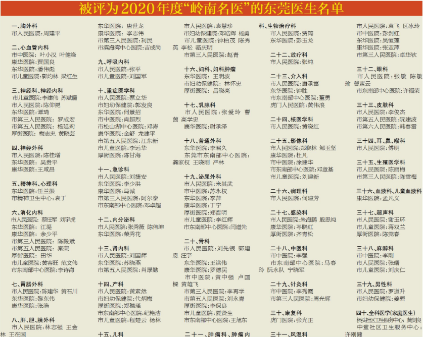 近日,广东省家庭医生协会公布了2020年度的《岭南名医录》,东莞162名医生上榜。