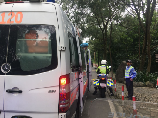接报后,寮步警方迅速派出警力前往现场处置。到场后,警方冲上山头,及时找到3名被困群众,将情况较为严重的一名女子背下山送上救护车,搀扶着另外两名症状较轻的男子下山。随后,两名铁骑队员为120救护车开道,在最短的时间内将伤者送往医院进行救治。