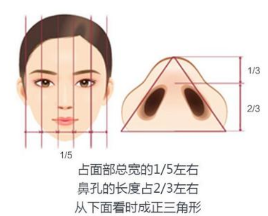 点大概在鼻子1/3处。而标准的鼻子形态——①上窄下宽的等边梯形;②山根最窄,鼻翼最宽;③鼻背宽度衔接流畅,过渡自然。