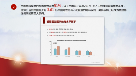 会议中提及,中国男科疾病的整体发病率为51%,以《中国统计年鉴2017》的人口抽样调查数据为基准,匡算出当前中国至少有3.61亿中国男性患有不同程度的男科疾病,男科疾病已经成为威胁男性健康的第三大疾病,遭受男性疾病侵害的患者不计其数。会议分析指出,导致该现象的主要因素有几种,包括基层医学教育水平的低下,男科学科水平不够专业;国内男性健康关注度不高,患者自身的重视程度低;有效治愈男科疾病的药物短缺、销售渠道有限等的原因。