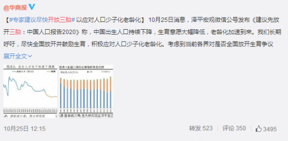 昨天,泽平宏观微信公号发布《建议先放开三胎:中国人口报告2020》称,中国出生人口持续下降,老龄化加速到来。建议在“十四五”时期尽快放开三孩,及时开始推进并观察效果。