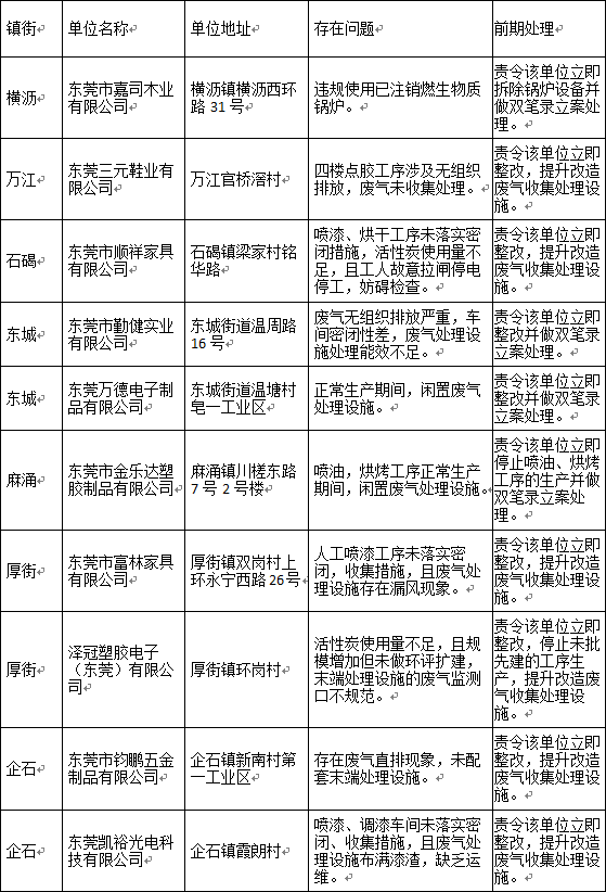 10月19日到10月24日,市大气办督查组深入大岭山、东城、横沥、虎门、桥头、沙田、万江等7个镇街,对31个涉气污染企业进行检查,其中2家涉及未批先建,无任何环保手续,已经被责令停业整改。一家企业被注销的生物质锅炉“死灰复燃”,被执法人员当即查封。